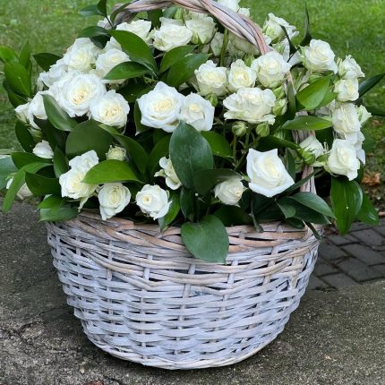 Корзина Прекрасная Иллюзия из роз сорта капучино, фридом, эустомы и кустовых роз