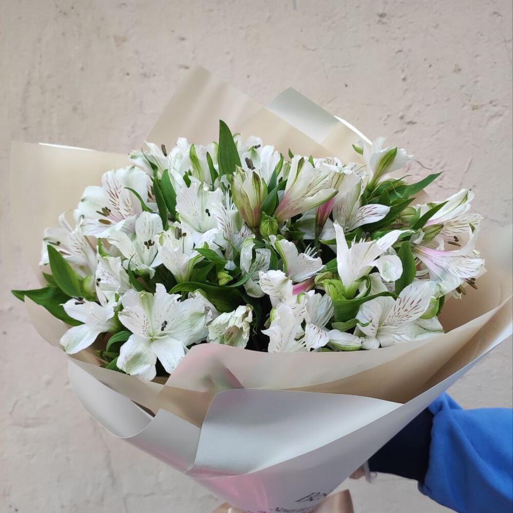 Альстромерия белая – 15 шт.Корейская пленка – 2 шт.Атласная лента – 2 шт.
