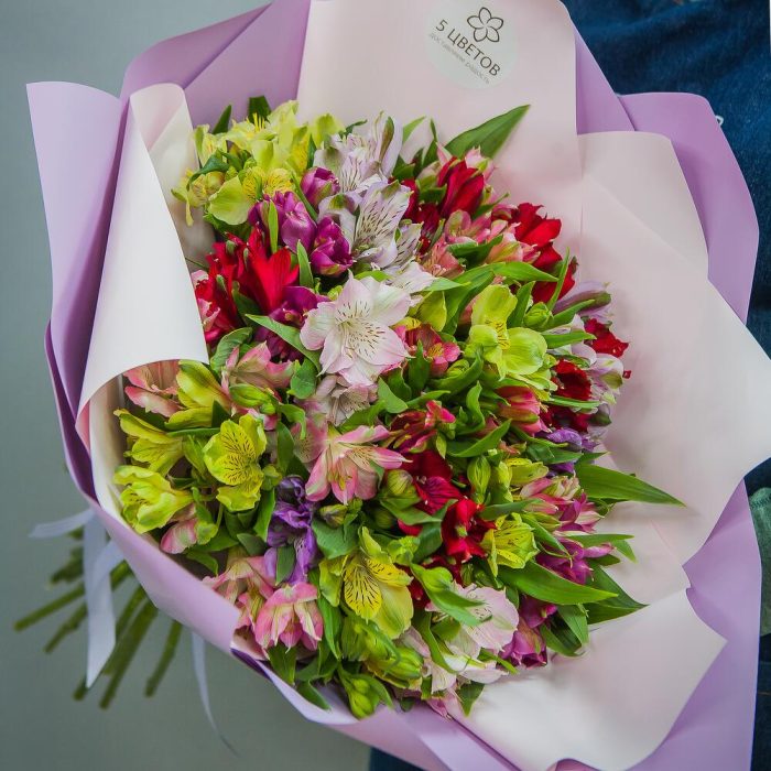 Альстромерия – 25 шт.дизайнерская упаковка и атласная лента – 1 шт.