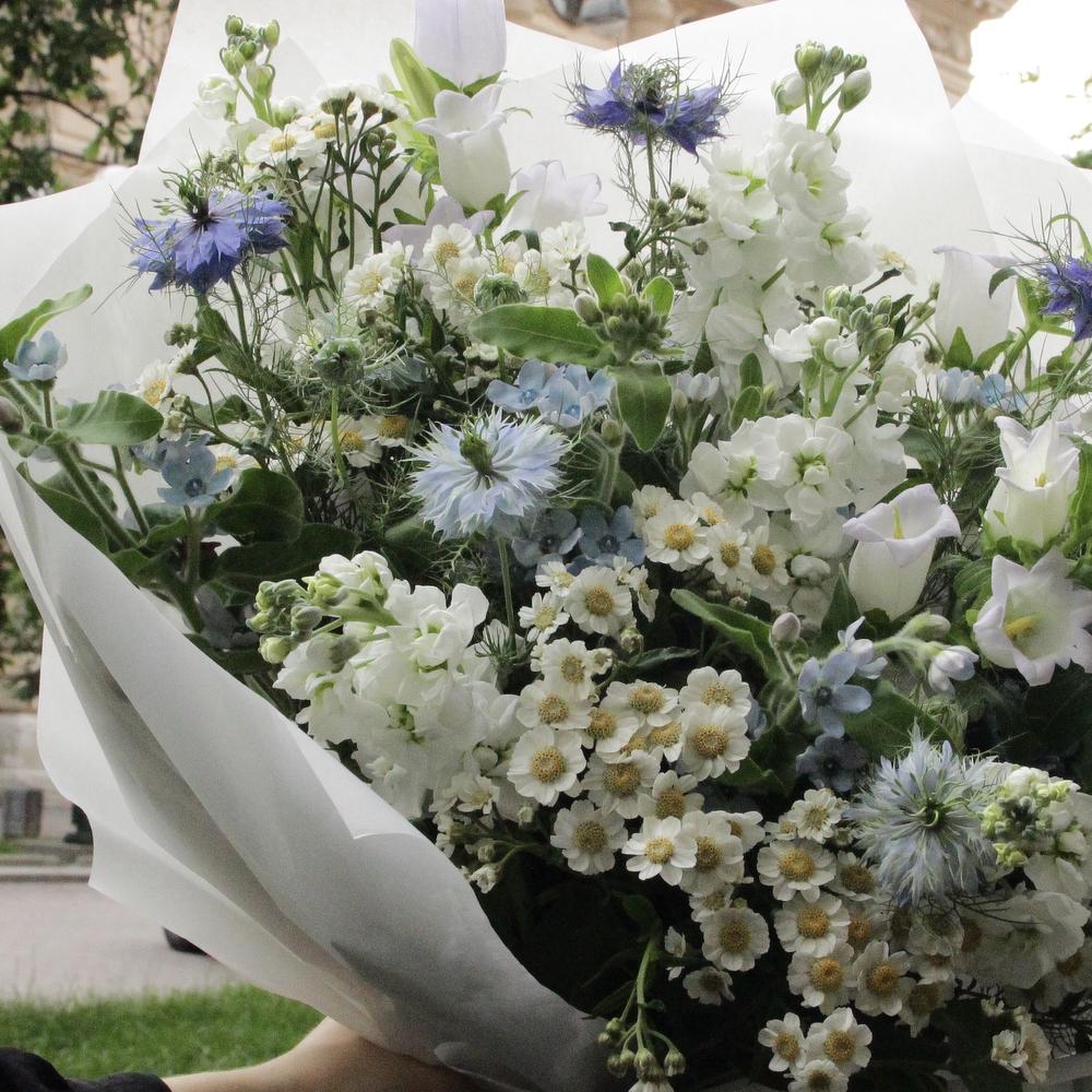Нигелла – 7 шт.Кампанула – 5 шт.Маттиола – 7 шт.Матрикария – 7 шт.Твидия – 5 шт.Фисташка – 3 шт.Дизайнерская упаковка – 2 шт.Лента атласная – 3 шт.