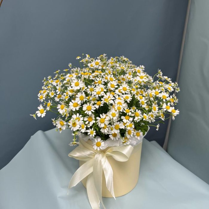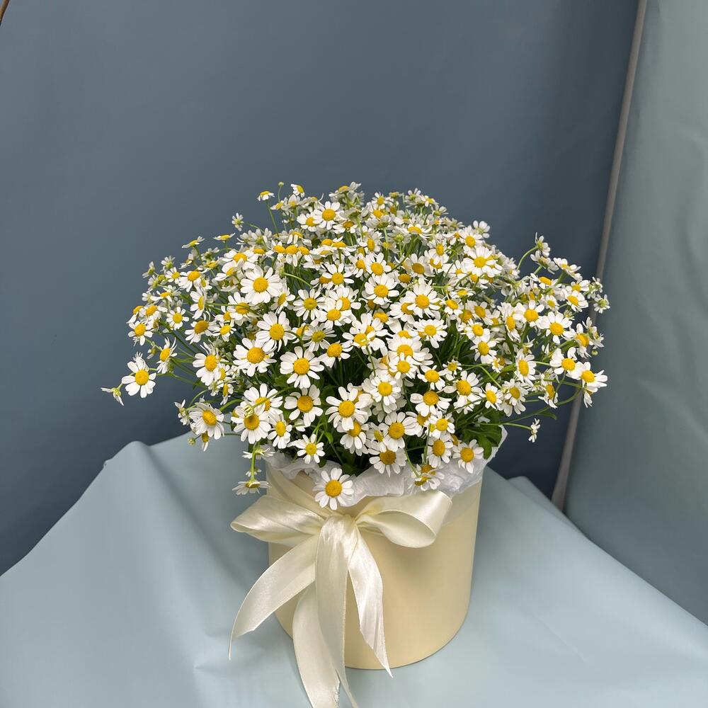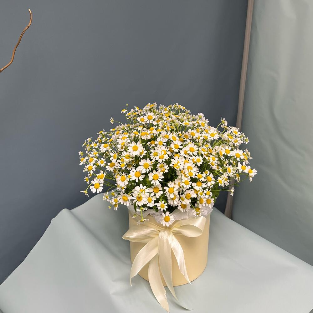 Матрикария – 11 шт.Тишью – 1 шт.Коробка шляпная – 1 шт.Лента атласная – 1 шт.Оазис флористический – 1 шт.
