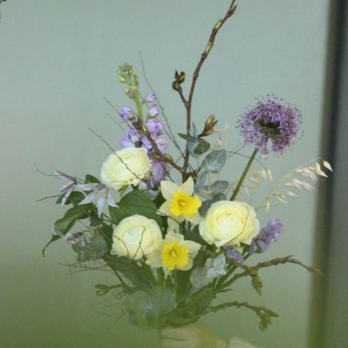 Ранункулюс – 3 шт.Нарцисс – 2 шт.лук полевой – 1 шт.Клематис – 1 шт.Маттиола – 1 шт.Овес – 5 шт.Ветка – 3 шт.Эвкалипт – 4 шт.Лента – 1 шт.