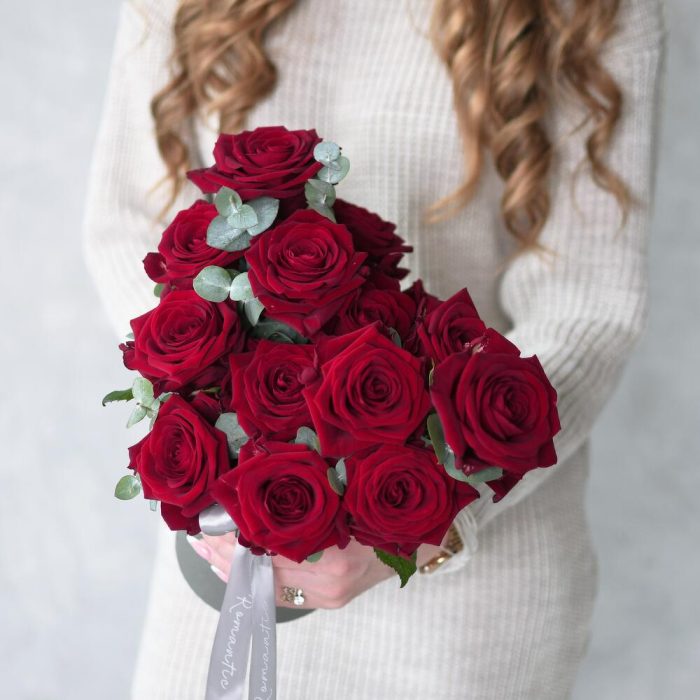 розы красные – 15 шт.Эвкалипт – 7 шт.Коробка шляпная – 1 шт.