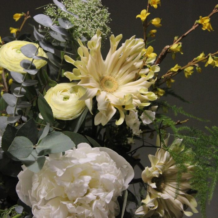 Пион – 2 шт.Амми – 2 шт.Ранункулюс – 3 шт.Фрезия – 2 шт.Гербера – 2 шт.флоксы – 3 шт.Эвкалипт – 5 шт.Лента – 1 шт.