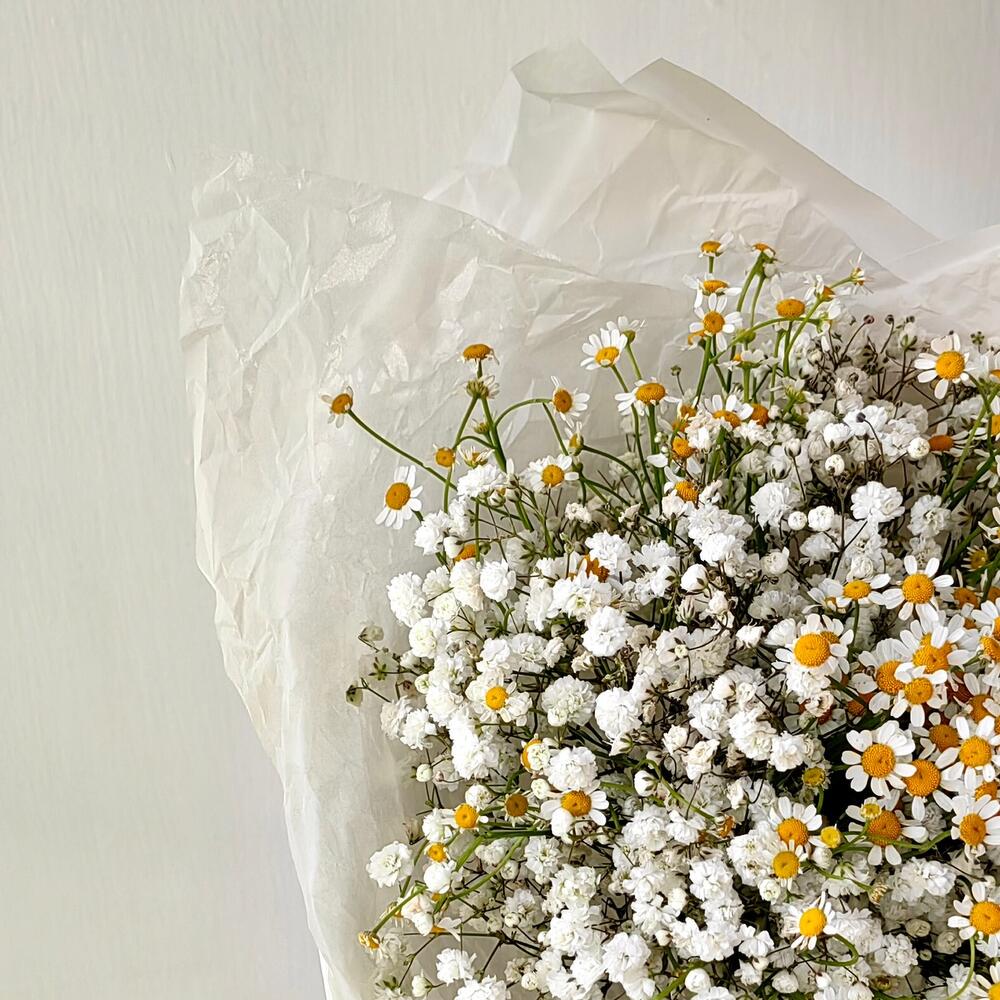 Лента атласная – 3 шт.Ромашка кустовая – 7 шт.Упаковка дизайнерская – 3 шт.гипсофила белая – 5 шт.