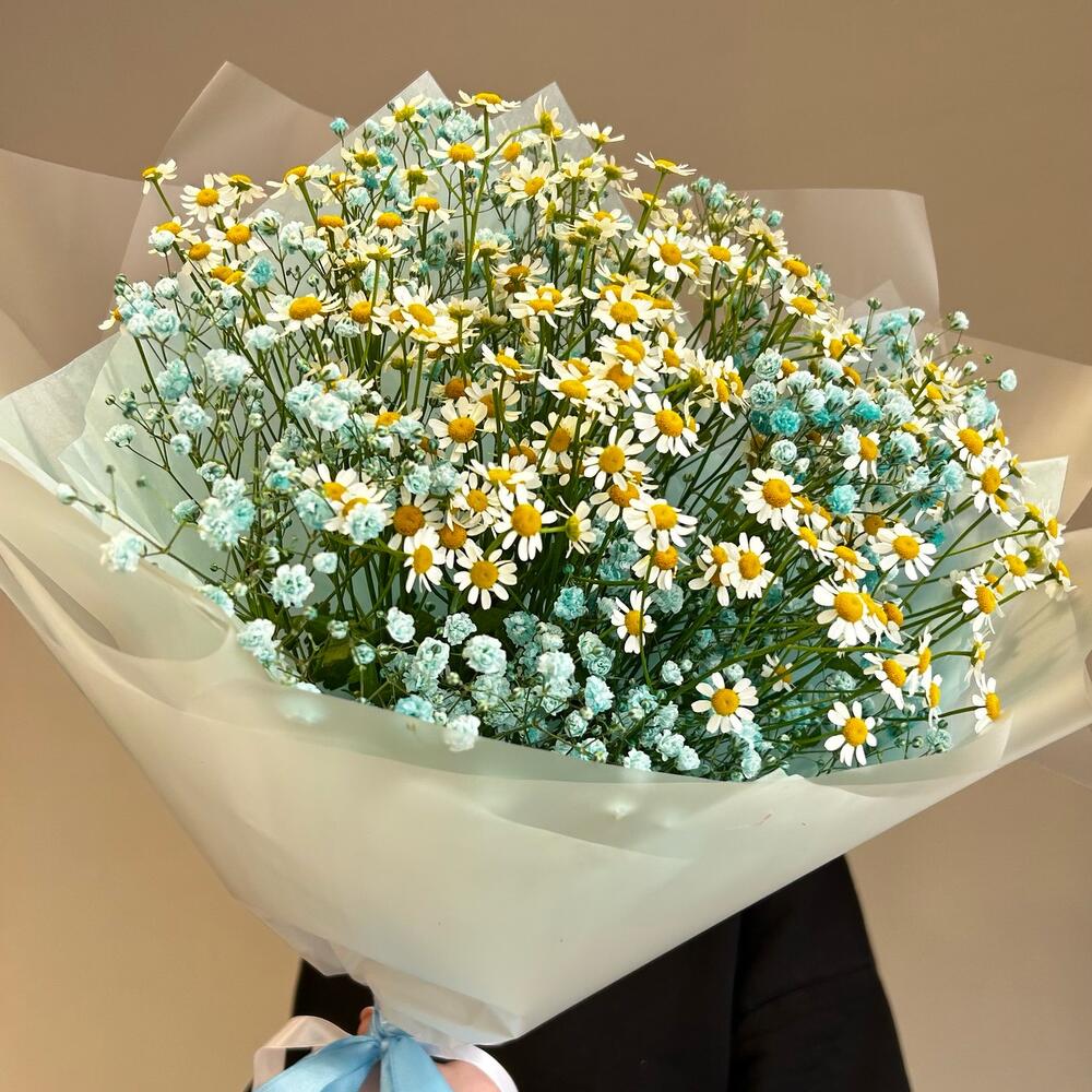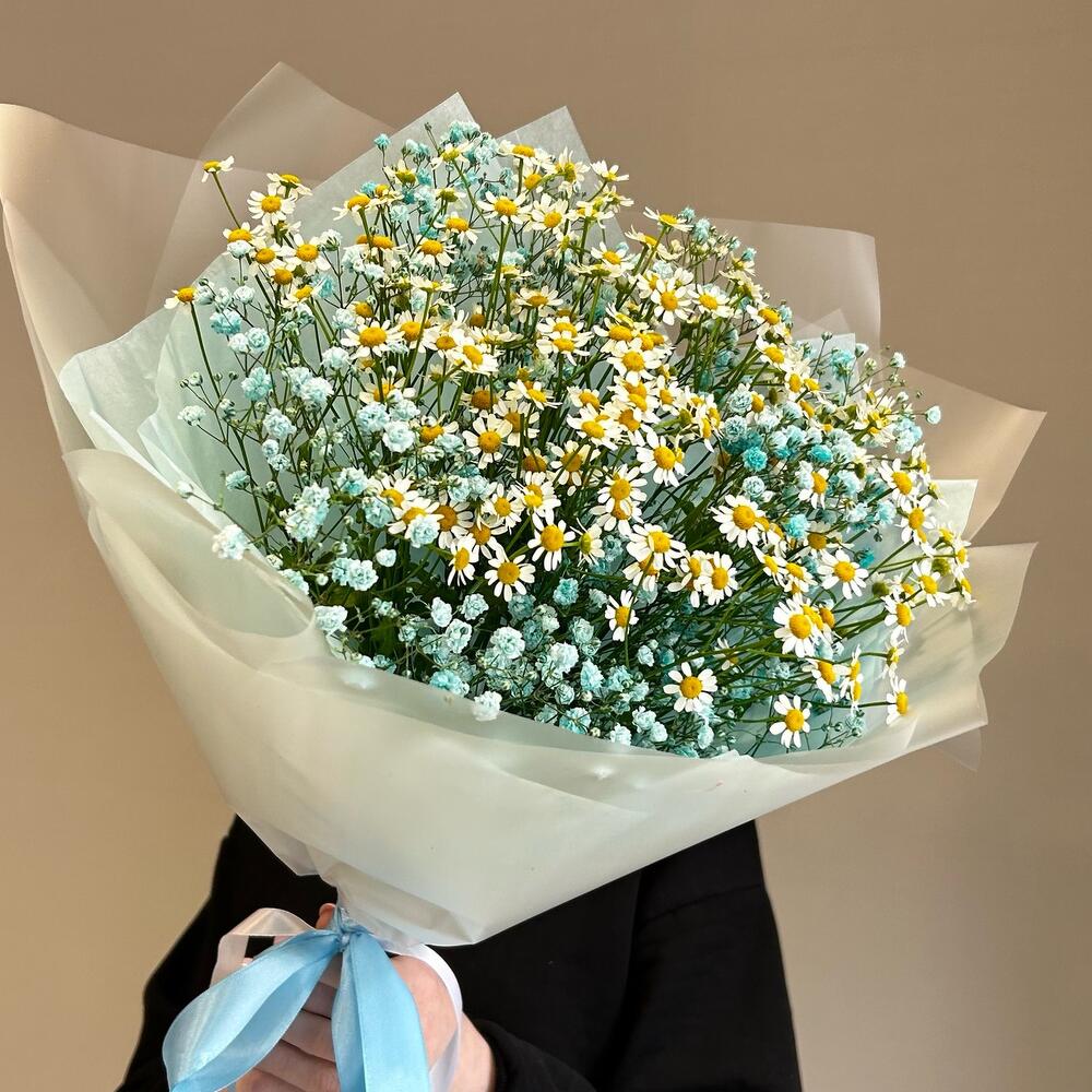 Гипсофила – 4 шт.Ромашка кустовая – 5 шт.Упаковка дизайнерская – 2 шт.
