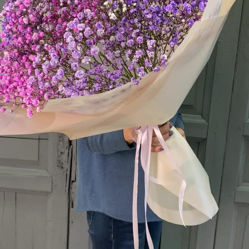 Гипсофила – 9 шт.Упаковка дизайнерская – 4 шт.Лента атласная – 1 шт.