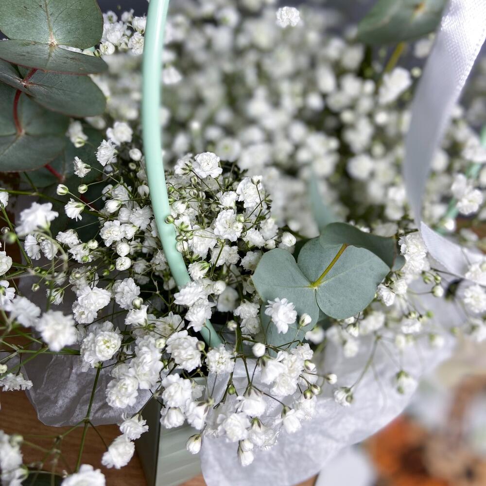 гипсофила белая – 4 шт.Эвкалипт ценерея – 3 шт.сумка плайм с ручками – 1 шт.