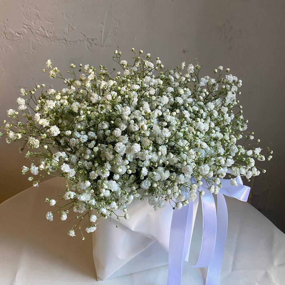 гипсофила белая – 5 шт.Упаковка дизайнерская – 2 шт.Лента атласная – 2 шт.открытка для пожеланий – 1 шт.