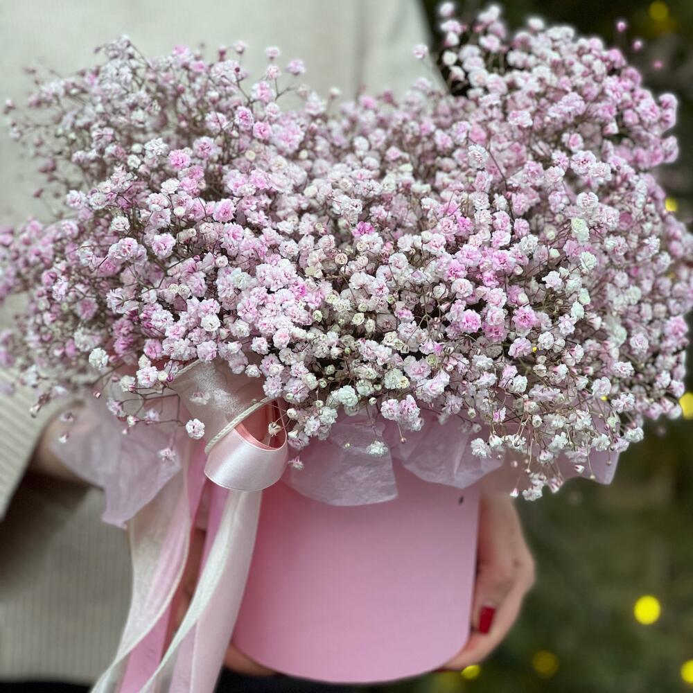 Гипсофила – 8 шт.Коробка – 1 шт.Оазис флористический – 1 шт.Тишью – 1 шт.Лента атласная – 1 шт.