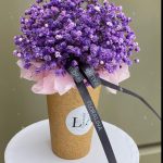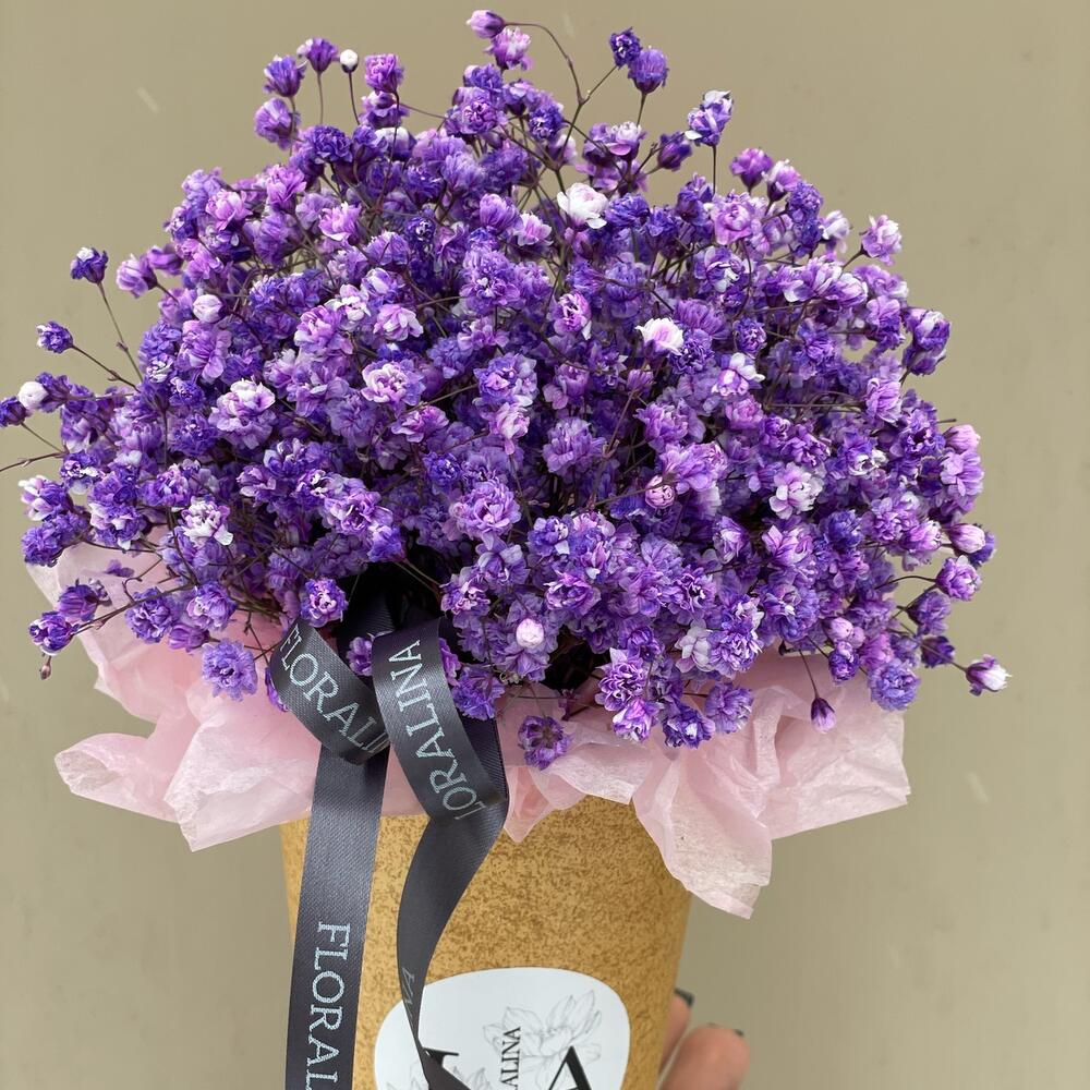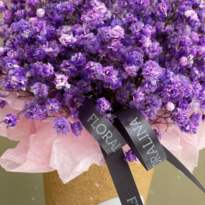 “Сиреневый туман” – композиция из гипсофилы в шляпной коробке
