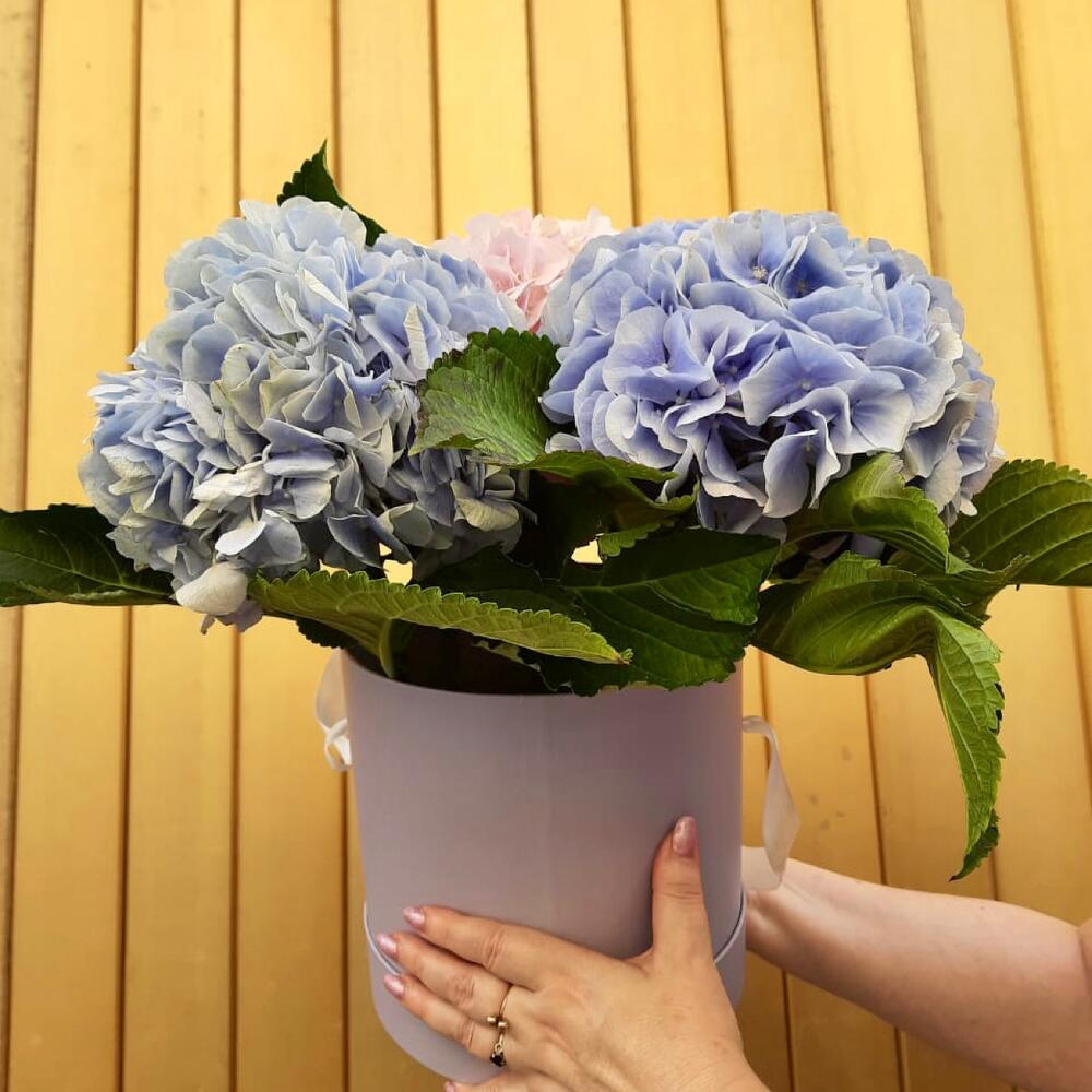 Оазис – 1 шт.Шляпная коробка – 1 шт.Гортензия микс – 5 шт.