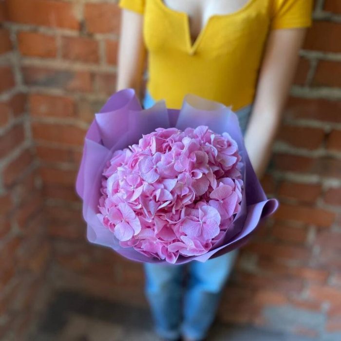 Пышная и яркая шапка нежно-розовой гортензии – идеальный подарок и ключик к самому неприступному сердцу, ведь этот цветок, так напоминает нам о теплых и солнечных летних деньках.