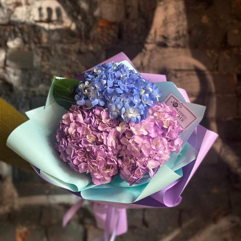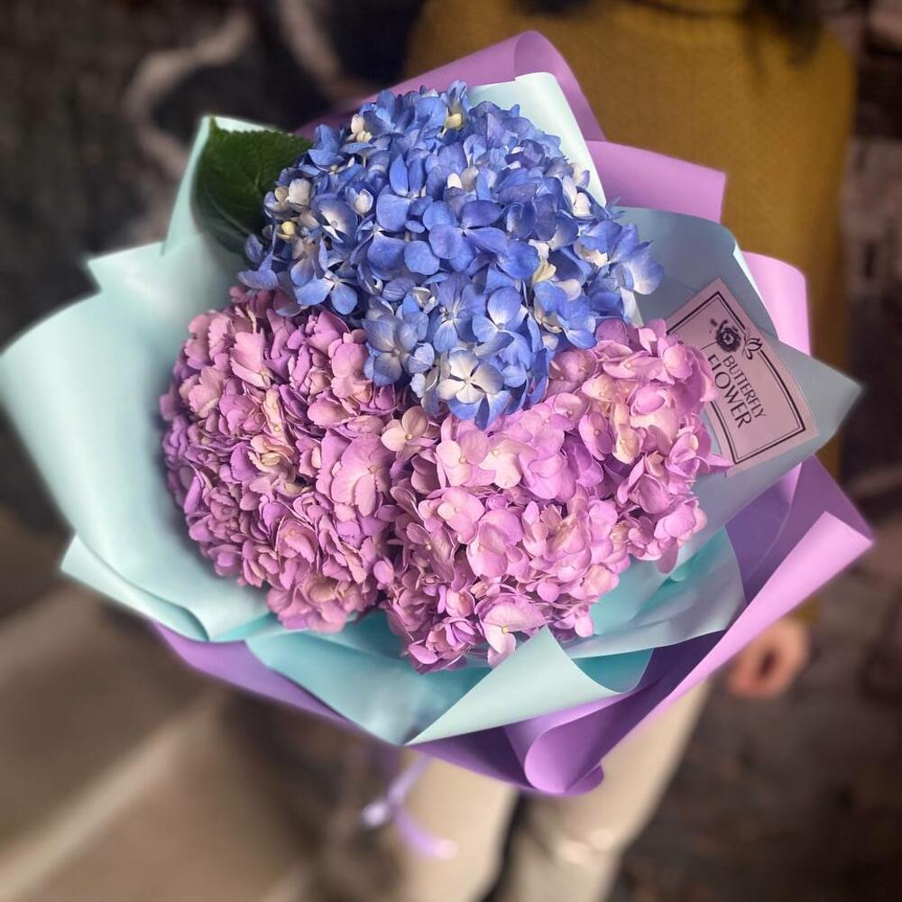 Красивый букет из 3 сиреневых и синих гортензий "Актау"