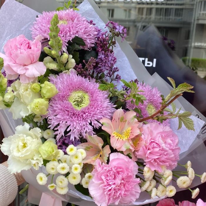 Хризантема одноголовая – 3 шт.Диантус сортовой – 3 шт.Альстромерия – 2 шт.матрикарья – 2 шт.антиринум белый – 2 шт.Сирень – 2 шт.эустома белая алиса – 2 шт.ветви малины – 3 шт.Упаковка дизайнерская – 4 шт.Лента атласная – 1 шт.