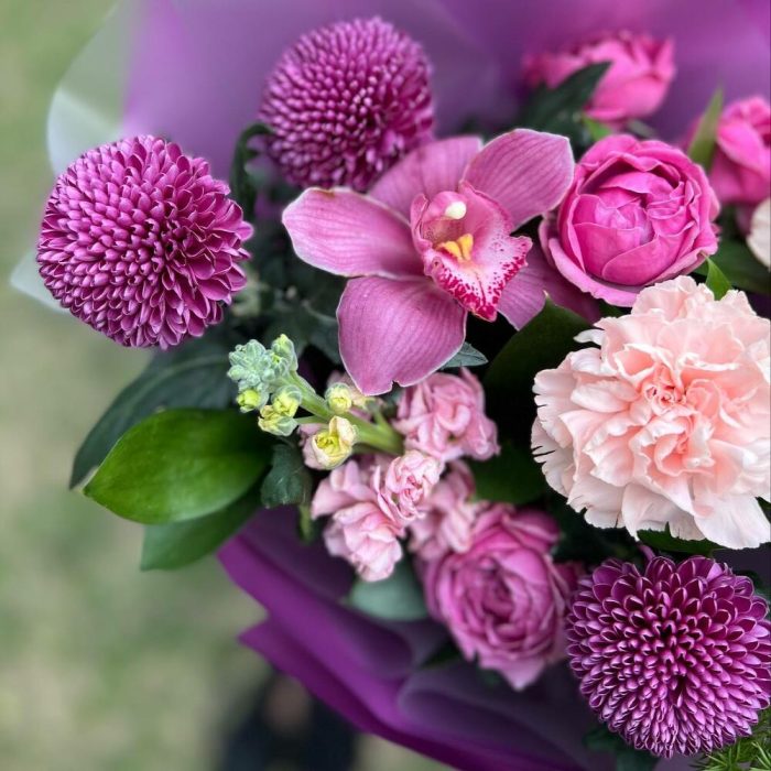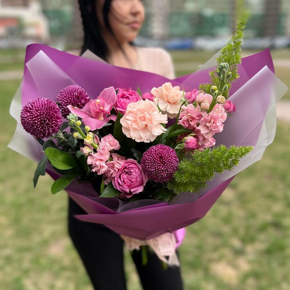 Роза кустовая пионовидная – 1 шт.Роза одноголовая пионовидная – 1 шт.Ранункулюс – 1 шт.Диантус – 1 шт.Хамелациум – 1 шт.Альстромерия – 1 шт.Эустома – 1 шт.Маттиола – 1 шт.Зелень – 1 шт.