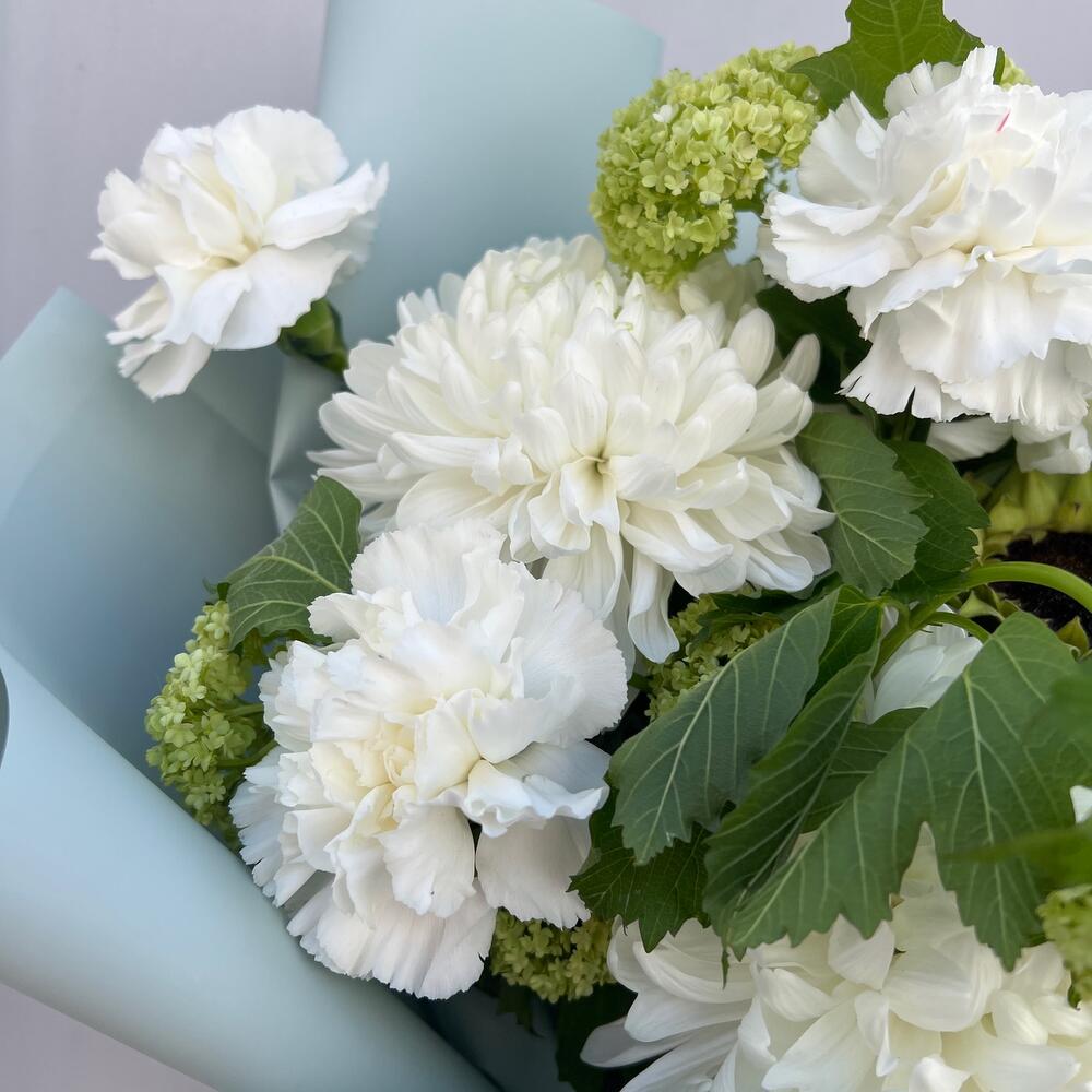 Хризантема Антонов – 3 шт.Вибурнум – 2 шт.Подсолнух – 1 шт.Диантус – 4 шт.Пленка дизайнерская – 1 шт.Лента – 1 шт.