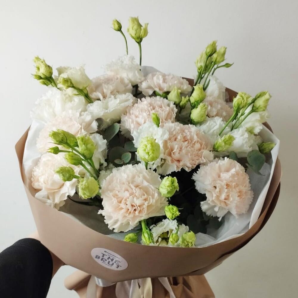 Гвоздика – 9 шт.Лизиантус – 3 шт.Эвкалипт – 1 шт.