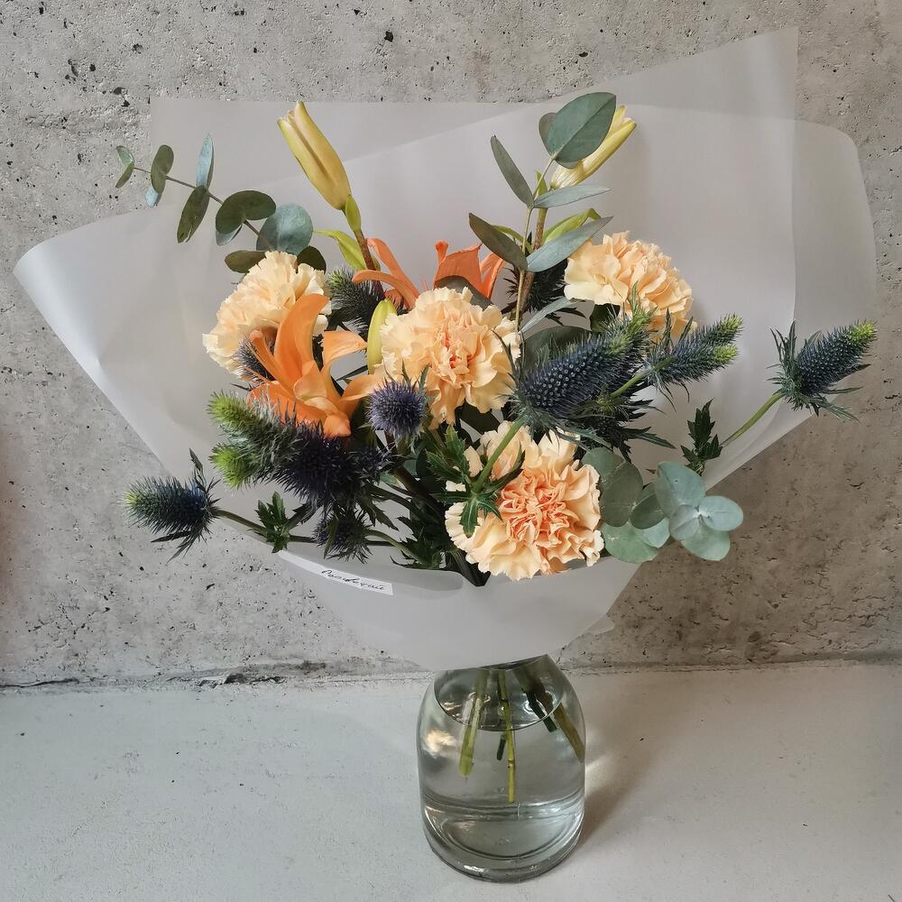 Лилия – 2 шт.Эвкалипт – 2 шт.Диантус – 4 шт.Эрингиум синий – 2 шт.Авторская упаковка – 1 шт.