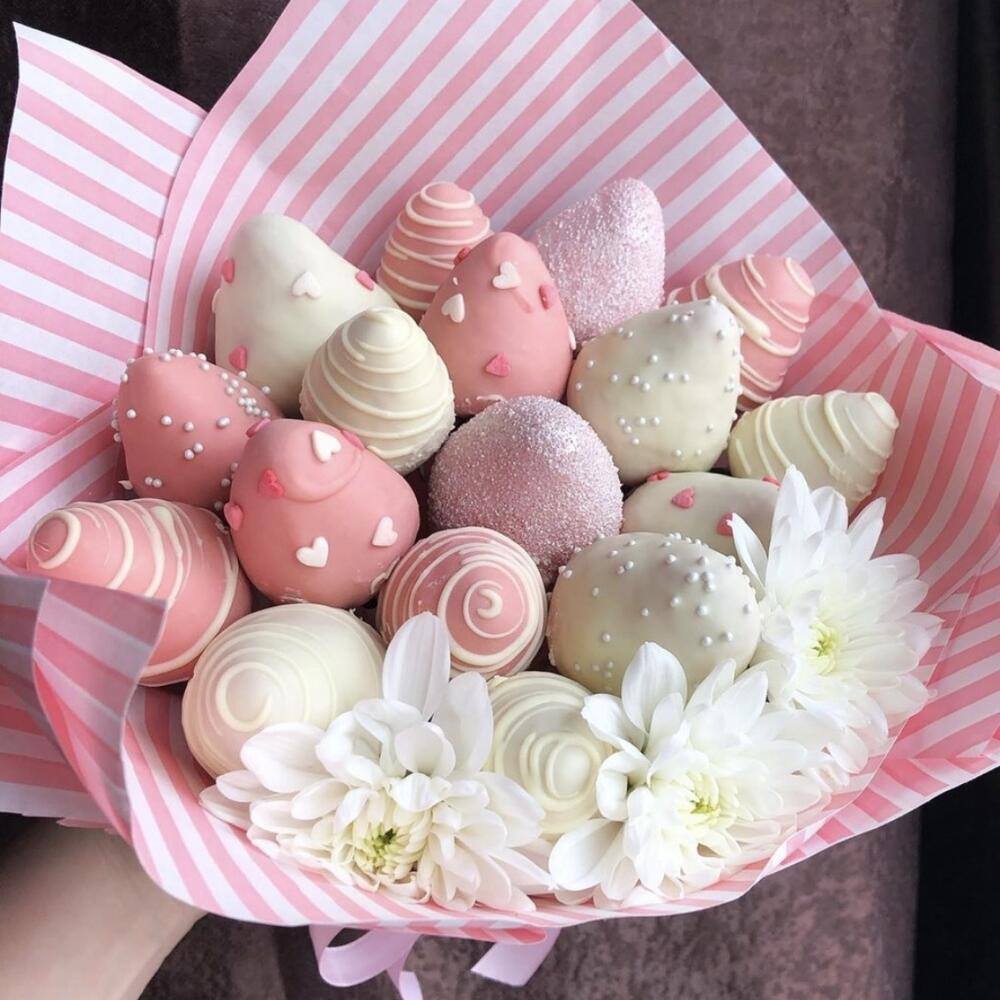 Клубника в шоколаде – 19 шт.Хризантема кустовая белая – 1 шт.Упаковка дизайнерская – 1 шт.