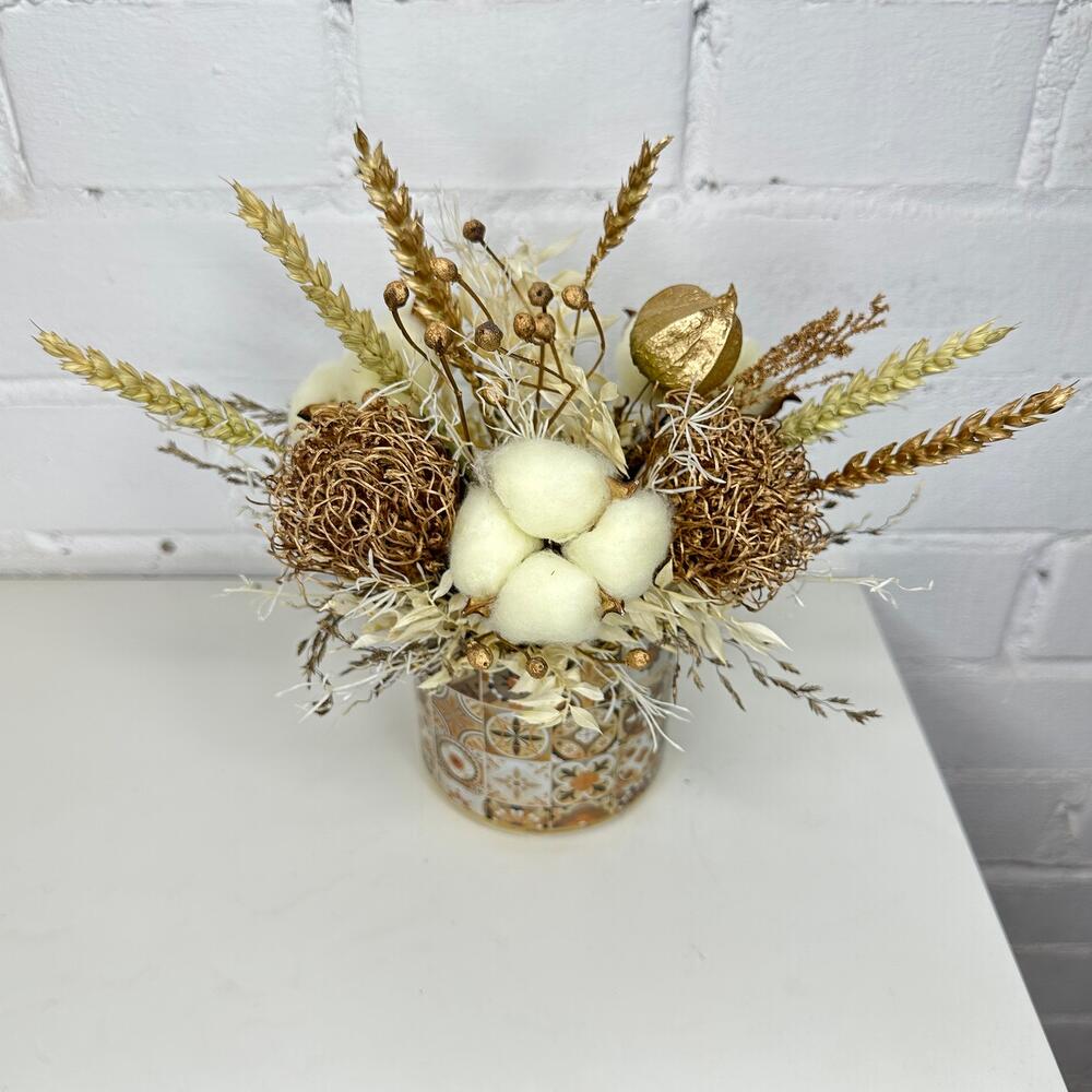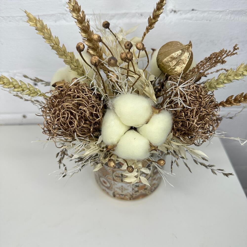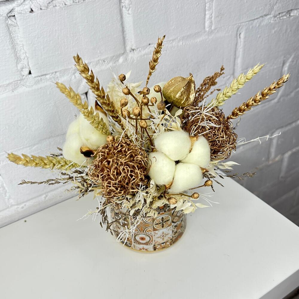 Колосья – 7 шт.Кашпо керамическое – 1 шт.Оазис флористический – 1 шт.Гелихризум – 3 шт.ларгус – 10 шт.гипсофила стабилизированная – 3 шт.леукондендрон – 2 шт.Хлопок – 3 шт.