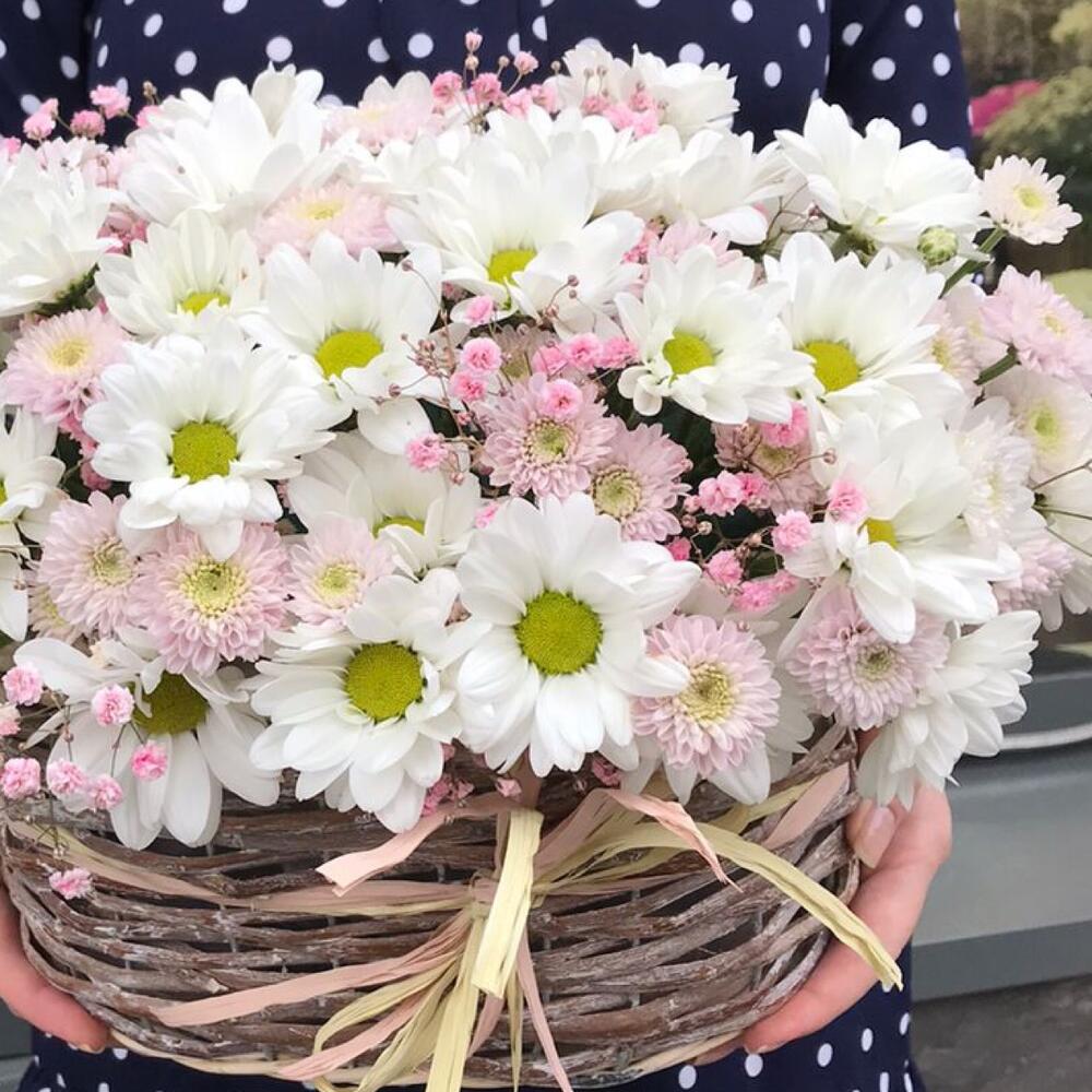 Сантини – 7 шт.Рафия – 2 шт.Корзина плетеная – 1 шт.Оазис флористический – 3 шт.Гипсофила розовая – 2 шт.Пленка дизайнерская – 1 шт.хризантем кустовая белая – 11 шт.
