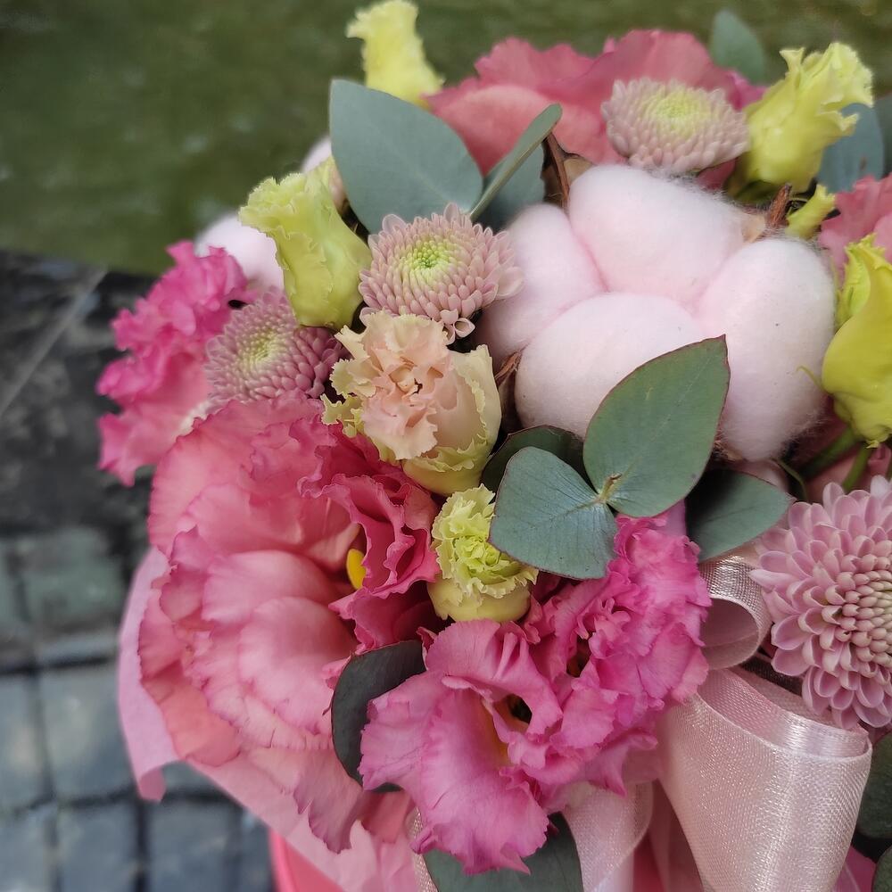 хлопок розовый – 3 шт.Эустома – 2 шт.Хризантема Сантини – 2 шт.Эвкалипт – 1 шт.Оазис – 1 шт.Коробка шляпная – 1 шт.