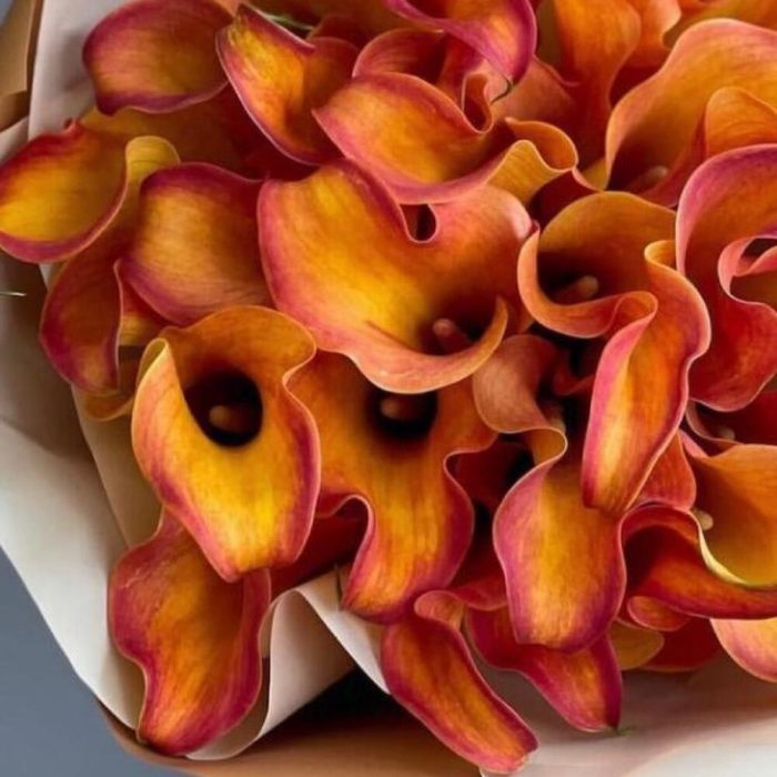 Калла оранжевая – 29 шт.Упаковка дизайнерская – 2 шт.Лента атласная – 2 шт.Открыточка с вашими пожеланиями – 1 шт.хорошее настроение – 100 шт.инструкция по уходу за цветами – 1 шт.коробка переноска – 1 шт.Кризал – 1 шт.