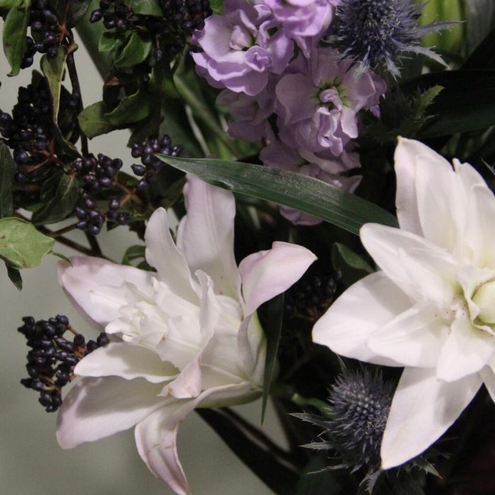 Лилия махровая – 3 шт.Амариллис – 1 шт.левкадендрон – 1 шт.Вибурнум – 3 шт.Эрингиум – 1 шт.Маттиола – 3 шт.магнолия ветка – 2 шт.эвкалипт стабилизируемый – 2 шт.Лента – 1 шт.