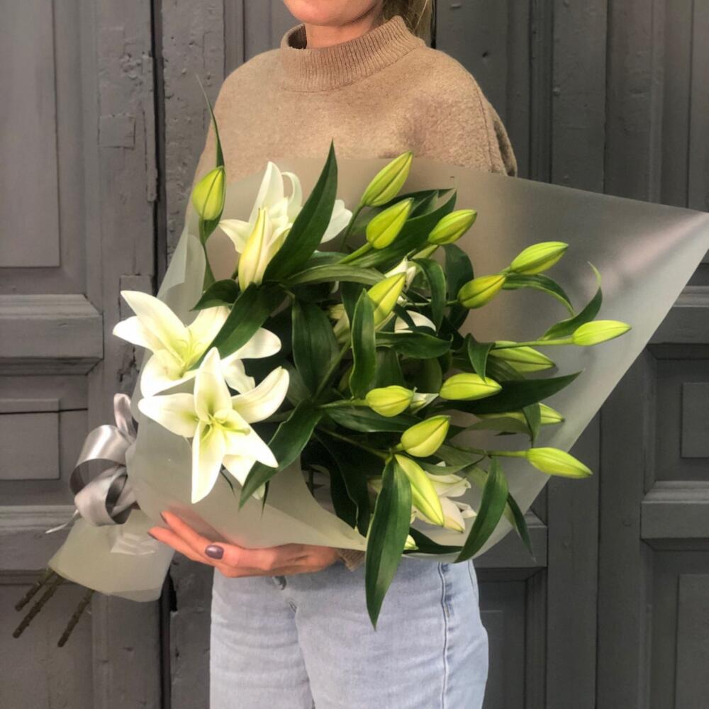 Лилия белая – 5 шт.Упаковка дизайнерская – 2 шт.Лента атласная – 2 шт.