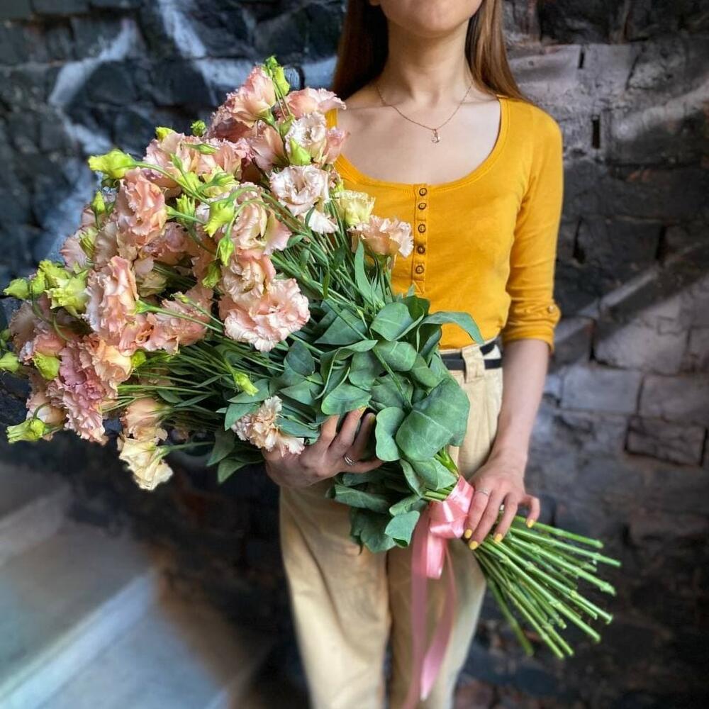 Букет из 31 персиковой эустомы (лизиантусов) в стильной упаковке “Каас”