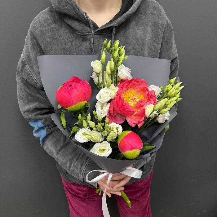 Лизиантус белый – 3 шт.Лента атласная белая – 1 шт.Упаковка корейская пленка – 1 шт.премиум пион Коралл шарм – 3 шт.
