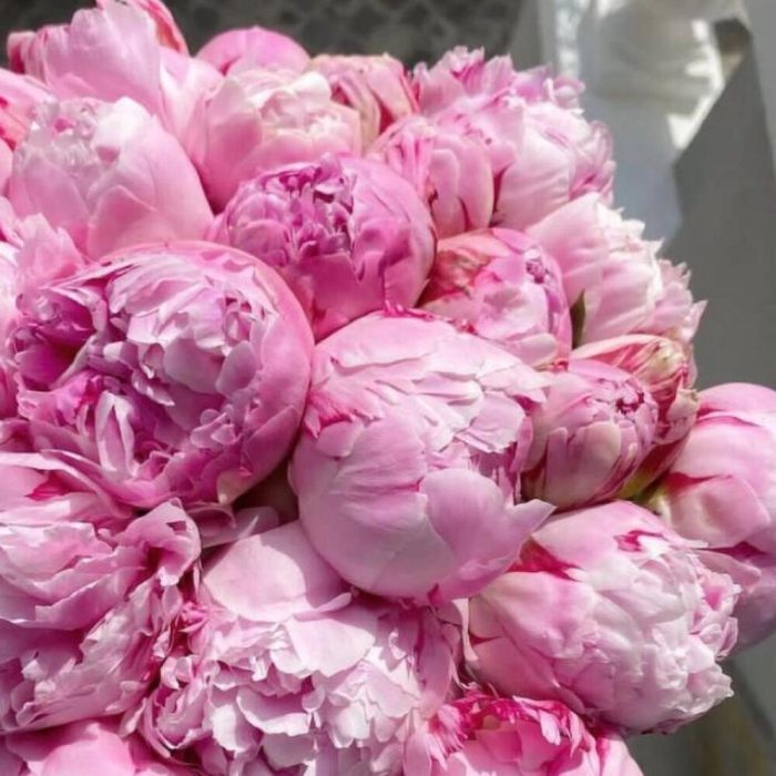 Пион розовый – 25 шт.Лента атласная – 2 шт.Открыточка с вашими пожеланиями – 1 шт.хорошее настроение – 100 шт.инструкция по уходу за цветами – 1 шт.коробка переноска – 1 шт.Кризал – 1 шт.