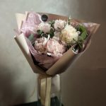 Атласная лента – 1 шт.декоративная упаковка – 1 шт.пионы – 5 шт.Эвкалипт – 3 шт.