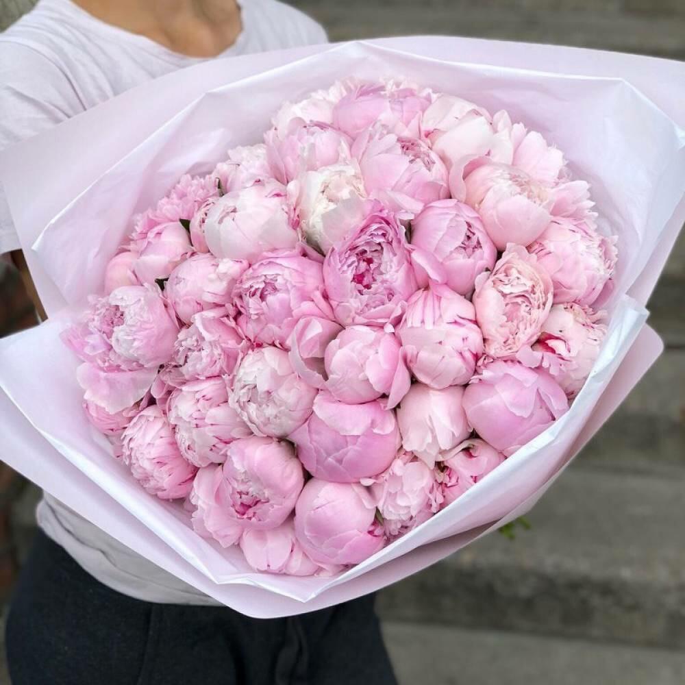 Букет живых цветов из 51 розовых пионов, сорт Сара Бернар/Подарок на День рождения, свадьбу, юбилей