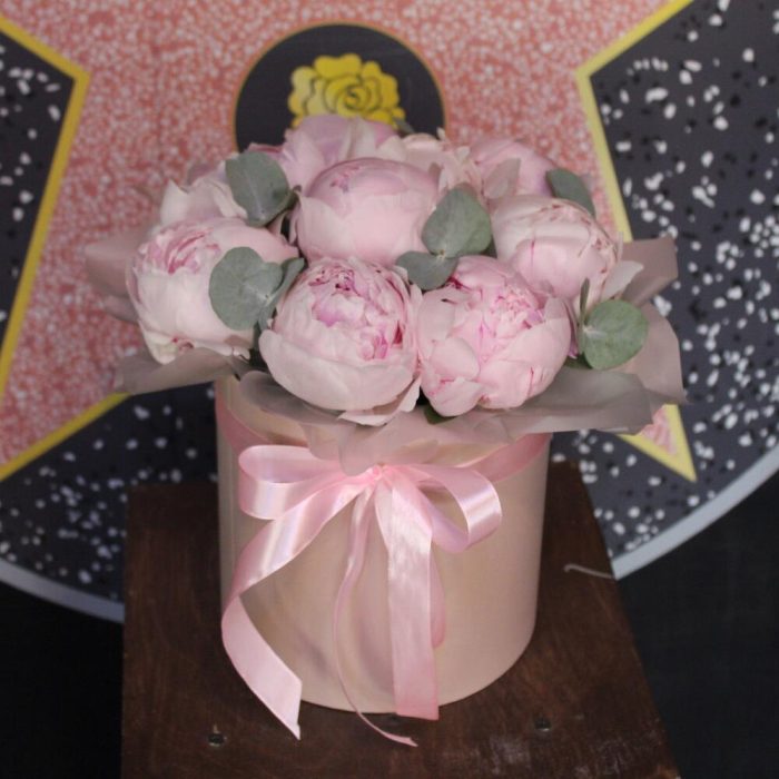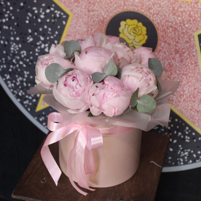 Эвкалипт – 2 шт.Лента атласная – 1 шт.Шляпная коробка – 1 шт.Пион Сара Бернар – 11 шт.Пленка матовая – 1 шт.Оазис флористический – 1 шт.
