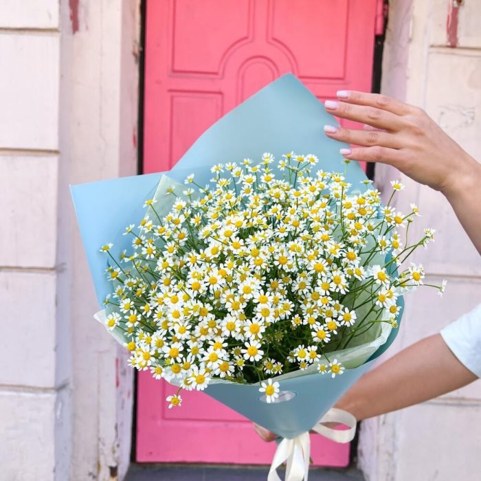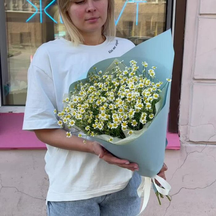 Лента атласная – 1 шт.Тишью – 2 шт.Аквапак – 1 шт.Матрикария (Ромашка Камила) – 15 шт.Корейская пленка – 3 шт.