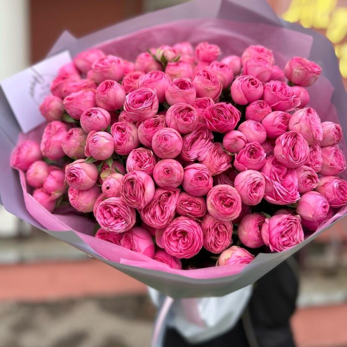 Тишью – 1 шт. Атласная лента – 1 шт. Кустовая пионовидная роза – 25 шт. Дизайнерская упаковка – 1 шт.