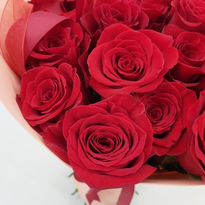 Стильный монобукет из 25 красных роз с оформлением – это классика, которая будет по нраву каждой девушке.