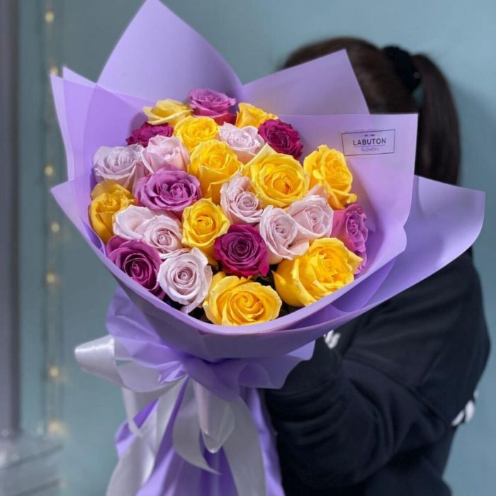 Роза – 25 шт. Атласная лента – 1 шт. аквабумага – 1 шт.