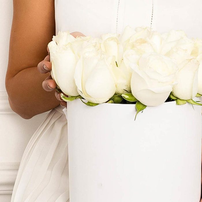 Роза белая – 25 шт.Коробка шляпная – 1 шт.Оазис флористический – 1 шт.