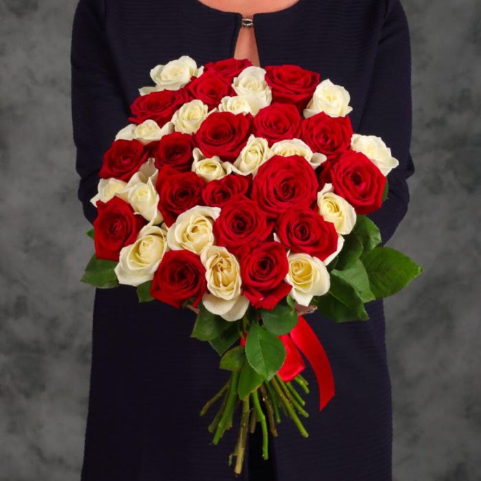 Букет из 35 красных и белых роз.