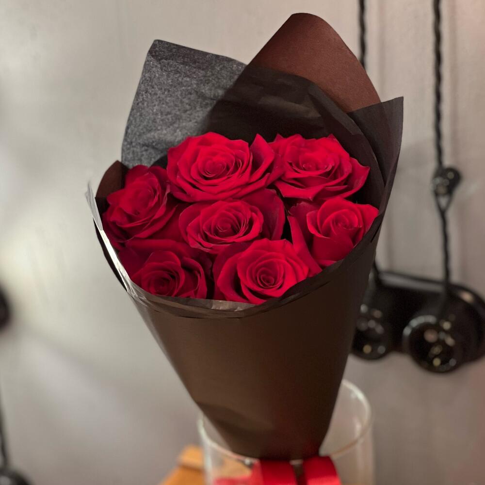 7 красных высоких роз в крафте «Встреча»