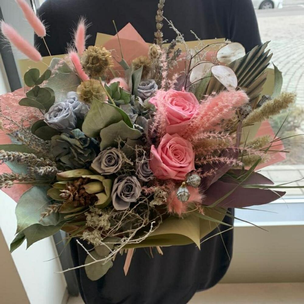 Лаванда (сухоцвет) – 1 шт.Эвкалипт – 1 шт.Шишка – 1 шт.Стабилизированная роза – 8 шт.Хлопок натуральный – 1 шт.Лагурус (сухоцвет) – 15 шт.пальма сухоцвет – 1 шт.сетария сухоцвет – 2 шт.лунник – 3 шт.
