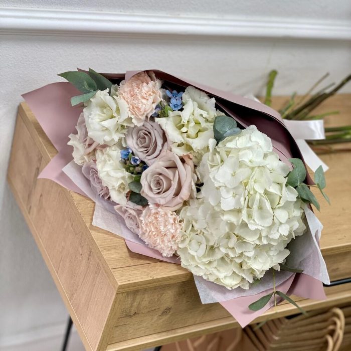 Эвкалипт – 3 шт.Гвоздика – 2 шт.Гортензия белая – 1 шт.Роза Мента – 5 шт.Пленка матовая – 1 шт.эустома белая – 2 шт.Тишью белое – 1 шт.оксипеталум голубой – 2 шт.