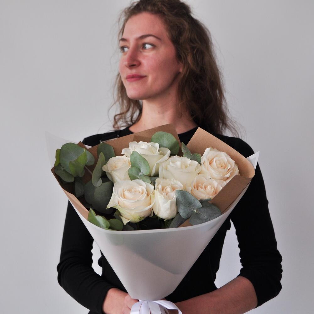 Эвкалипт – 2 шт.Лента атласная – 1 шт.Упаковка дизайнерская – 2 шт.Роза Эквадор 60 см – 7 шт.