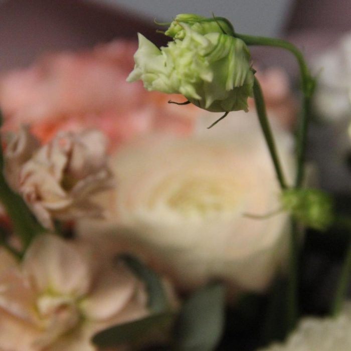 Ранункулюс – 3 шт.Роза кустовая пионовидная – 2 шт.Маттиола – 3 шт.Лизиантус – 2 шт.Эвкалипт – 5 шт.Тишью – 2 шт.Бумага – 2 шт.Лента – 1 шт.