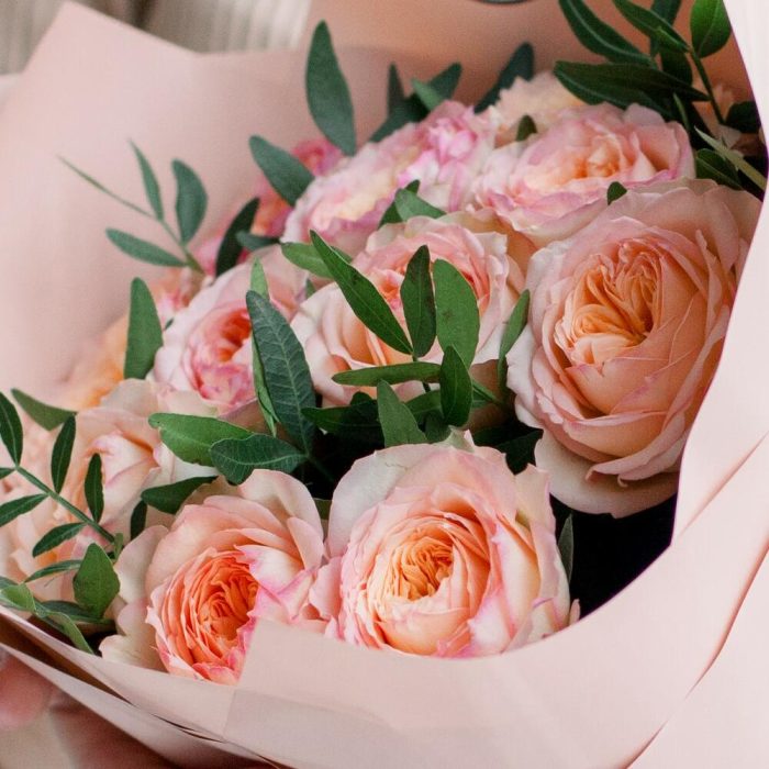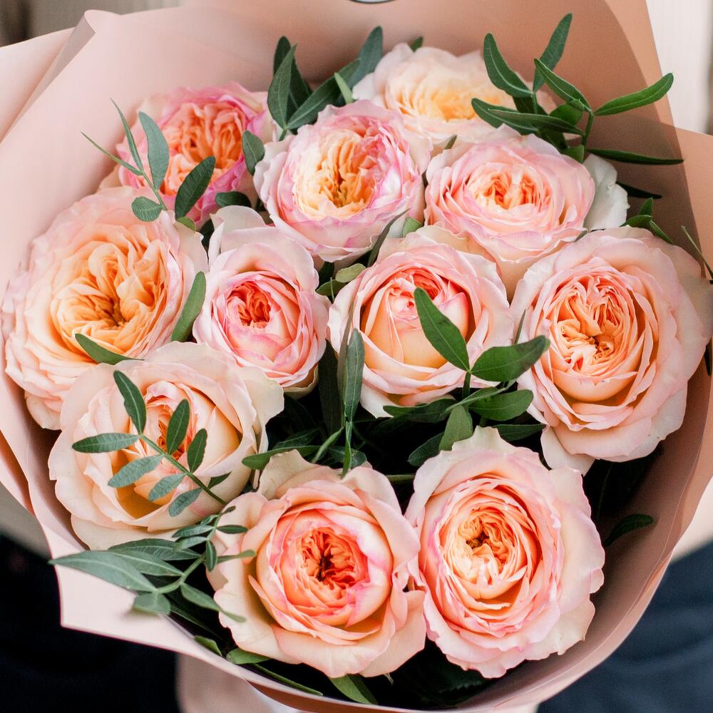 Букет из 11 персиковых пионовидных роз Flash Back 40 см с фисташкой в кремовой пленке
