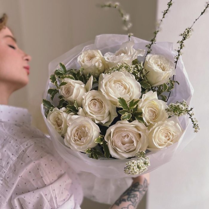 Зелень – 7 шт.Пионовидная роза – 11 шт.Упаковка дизайнерская – 1 шт.