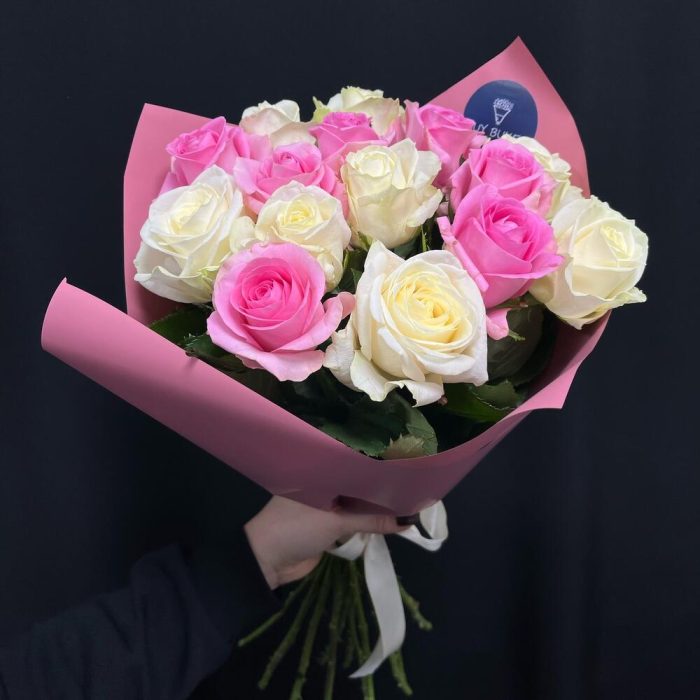 Розовая роза – 7 шт.белая роза – 8 шт.Упаковка цветная – 2 шт.Лента атласная – 4 шт.